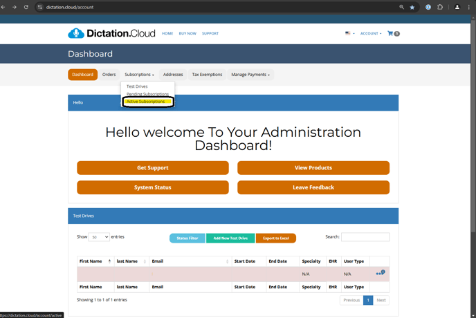 2) Under Dashboard, select the "Subscriptions" tab, then click "Active Subscriptions" from the dropdown menu.