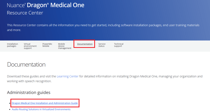 3) Click on the documentation tab and then click on the Dragon Medical One Installation and Administration Guide: