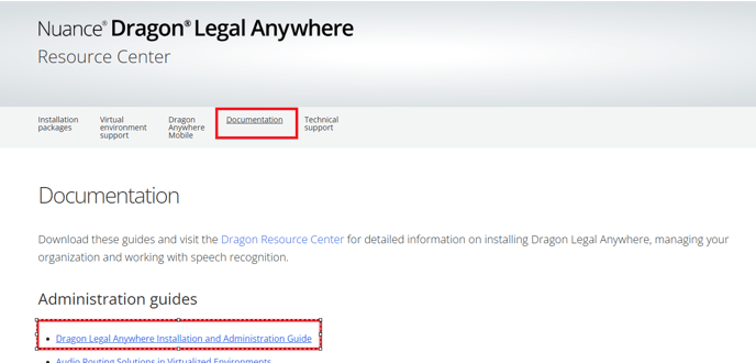 3) Click on the documentation tab and then click on the Dragon Legal Anywhere Installation and Administration Guide: