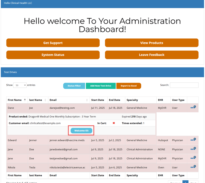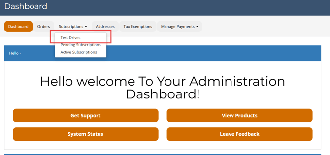 2.) Under Dashboard, select the "Subscriptions" tab, then click "Test Drives" from the dropdown menu.